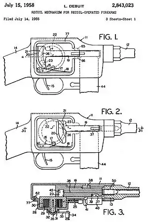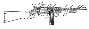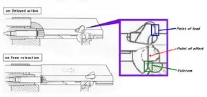 Використовує важільний сповільнювач відходу бойової личинки затвора. Затвор складається з двох частин, енергія віддачі перерозподіляється від передньої частини до задньої за рахунок передавального важеля (прискорювача), який їх зв'язує, що взаємодіє зі спеціальним виступом затворної коробки. При цьому передня частина затвора гальмується, а задня — навпаки, відходить назад прискорено.