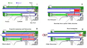 Система з газовим уповільненням використовує циліндр, який в момент пострілу заповнюється пороховими газами, які відводяться з каналу ствола. Поршень газового циліндра з'єднаний з затвором таким чином, що тиск в циліндрі при пострілі гальмує його відхід назад. Після падіння тиску газу в стволі тиск в циліндрі також падає, що дозволяє поршню рухатися в циліндрі, не перешкоджаючи відкриттю затвора.