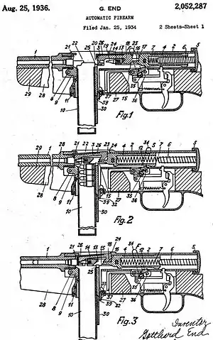 Його пістолет-кулемет мав напіввільний затвор, відхід якого назад сповільнювався за рахунок взаємодії двох гвинтових пар в затворній групі: затвор — поворотна муфта і поворотна муфта — гвинтовий хвостовик. Під час відкоту рухомих частин затвор поздовжньо переміщається по напрямних ствольної коробки, муфта обертається, а хвостовик залишається нерухомим — від оберту він фіксується виступом, який входить в паз на торці ствольної коробки. При цьому муфта, навертаючись на хвостовик, вивертається з затвора. Таким чином муфта і затвор, рухаючись назад, як би «розбігаються» відносно один одного, швидкість відкоту затвора знижується і збільшується час повного відкривання затвора.