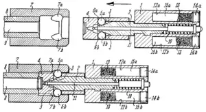 Використовує для уповільнення ходу затвора опір важелів кривошипно-шатунного механізму, які підпирають його ззаду, що знаходяться в момент пострілу в положенні поблизу мертвої точки.