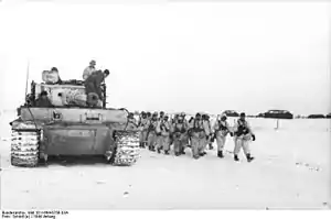 ![]() Німецькі піхотинці при підтримці танків Panzer VI «Тигр» в боях за Нарву. 1944 Німецькі піхотинці при підтримці танків Panzer VI «Тигр» в боях за Нарву. 1944 | |||||||