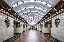 На торцевій стіні центрального підземного залу спочатку знаходилося велике мозаїчне панно «Сталін на трибуні», Роботи президента Академії Мистецтв А. М. Герасимова . Спочатку на барвистому тлі планувалося встановити погруддя Сталіна.