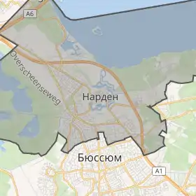 Нарден складається з двох частин: старе місто-фортеця і котеджний район, який виник уже після 1900 року і утворює єдине ціле із сусіднім містом Бюссюм. Нарден знаходиться між озером Гоомір, яке раніше було частиною штучного озера Зейдерзе, і лісовою горбистою місцевістю «Хет Гуй». Місто лежить на автомагістралі А1 Амстердам–Амерсфорт, на відстані близьк 20 кілометрів від обох міст.
