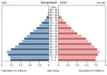 Населення Банґладеш. Чисельність населення країни 2015 року становила 168,957 млн осіб (9-те місце у світі)[1]. Чисельність банґладешців стабільно збільшується, народжуваність 2015 року становила 21,14 ‰ (76-те місце у світі), смертність — 5,61 ‰ (174-те місце у світі), природний приріст — 1,6 % (75-те місце у світі)