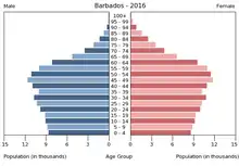 Населення Барбадосу. Чисельність населення країни 2015 року становила 290,6 тис. осіб (181-ше місце у світі)[1]. Чисельність барбадосців стабільно збільшується, народжуваність 2015 року становила 11,87 ‰ (168-ме місце у світі), смертність — 8,44 ‰ (80-те місце у світі), природний приріст — 0,31 % (173-тє місце у світі)