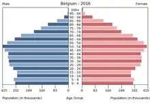 Населення Бельгії. Чисельність населення країни 2015 року становила 11,323 млн осіб (78-ме місце у світі)[1]. Чисельність бельгійців потроху збільшується, народжуваність 2015 року становила 11,41 ‰ (171-ше місце у світі), смертність — 9,63 ‰ (52-ге місце у світі), природний приріст — 0,76 % (143-тє місце у світі)