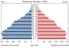 Населення Домініканської Республіки. Чисельність населення країни 2015 року становила 10,478 млн осіб (87-ме місце у світі)[1]. Чисельність домініканців стабільно збільшується, народжуваність 2015 року становила 18,73 ‰ (93-тє місце у світі), смертність — 4,55 ‰ (201-ше місце у світі), природний приріст — 1,23 % (96-те місце у світі)