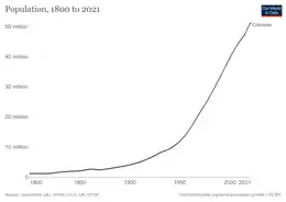 Населення Колумбії. Чисельність населення країни 2015 року становила 46,736 млн осіб (30-те місце у світі)[1]. Чисельність колумбійців стабільно збільшується, народжуваність 2015 року становила 6,47 ‰ (114-те місце у світі), смертність — 5,4 ‰ (177-ме місце у світі), природний приріст — 1,04 % (115-те місце у світі)