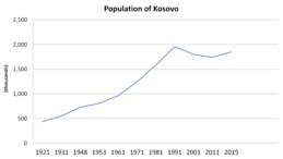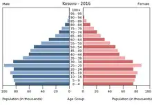 Населення Косова. Чисельність населення країни 2015 року становила 1,87 млн осіб (151-ше місце у світі)[1]. Чисельність косоварів стабілізувалась і незначно збільшується, народжуваність 2015 року становила 17,09 ‰, смертність — 7,1 ‰, природний приріст — 6,4 ‰ ![]()