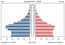 Населення Саудівської Аравії. Чисельність населення країни 2015 року становила 27,752 млн осіб (47-ме місце у світі)[1]. За даними ООН доля трудових мігрантів в країні становить 30 % наявного населення. Чисельність аравійців стабільно збільшується, народжуваність 2015 року становила 18,51 ‰ (94-те місце у світі), смертність — 3,33 ‰ (219-те місце у світі), природний приріст — 1,46 % (81-ше місце у світі)