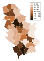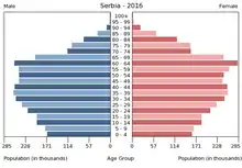 Населення Сербії. Чисельність населення країни 2015 року становила 7,176 млн осіб, включно з населенням Косова (102-ге місце у світі)[1]. Чисельність сербів стабільно зменшується, народжуваність 2015 року становила 9,08 ‰ (209-те місце у світі), смертність — 13,66 ‰ (12-те місце у світі), природний приріст — -0,46 % (222-ге місце у світі)