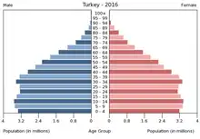 Населення Туреччини. Чисельність населення країни 2015 року становила 79,414 млн осіб (19-те місце у світі)[1]. Чисельність турків стабільно збільшується, народжуваність 2015 року становила 16,33 ‰ (118-те місце у світі), смертність — 5,88 ‰ (170-те місце у світі), природний приріст — 1,26 % (93-тє місце у світі)