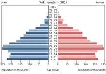 Населення Туркменістану. Чисельність населення країни 2015 року становила 5,231 млн осіб (120-те місце у світі)[1]. Чисельність туркменів стабільно збільшується, народжуваність 2015 року становила 19,4 ‰ (89-те місце у світі), смертність — 6,13 ‰ (158-ме місце у світі), природний приріст — 1,14 % (106-те місце у світі)