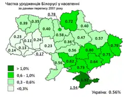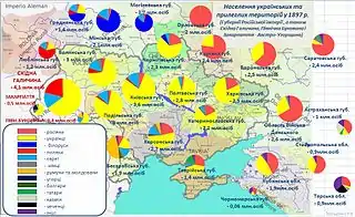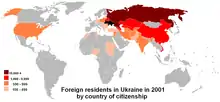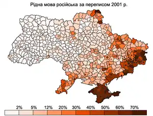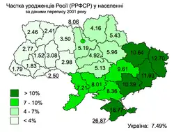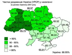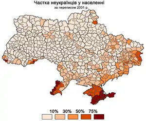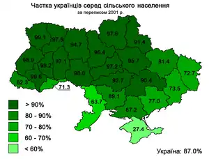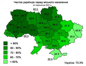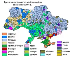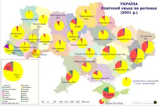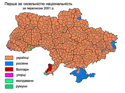 Україну населяють переважно українці, їхня частка превалює над частками інших народів в усіх областях, окрім Криму, де частка росіян трохи більша за половину. У містах, особливо сходу та півдня, велика частка росіян та представників інших народів, що обумовлено масовою імміграцією в часи перебування у складі Російської імперії та особливо Радянського Союзу. Регіонами компактного проживання національних меншин є: кримські татари — Крим, румуни й молдовани — Буковина, угорці — Закарпаття, болгари, молдовани й гагаузи — Одещина, болгари й греки — Приазов'я