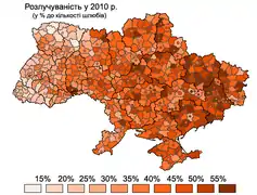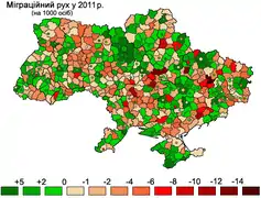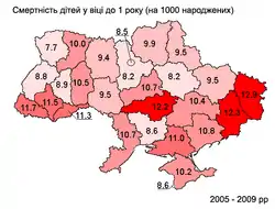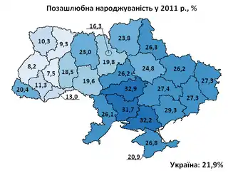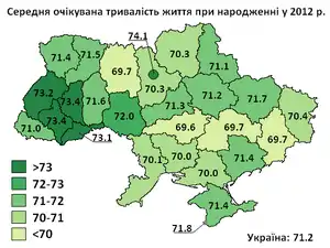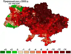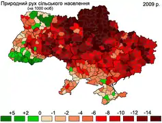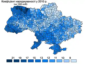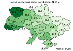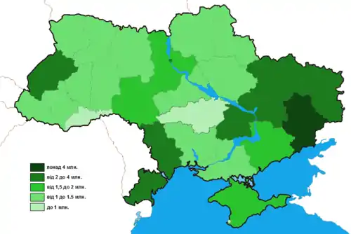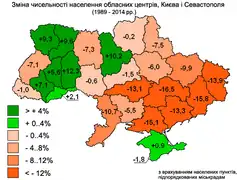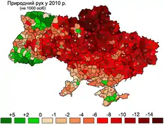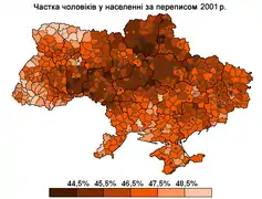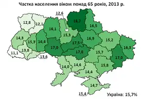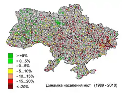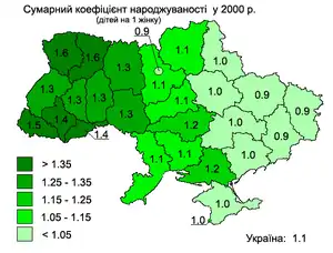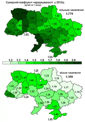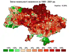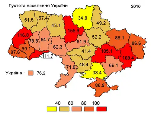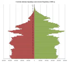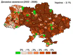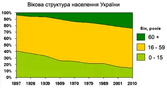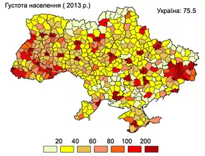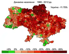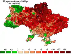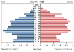 Чисельність насе́лення Украї́ни на 1 липня 2020 року згідно з даними ООН становила 43,733 млн осіб разом з Кримом (35-те місце у світі)[1]. За оцінкою Державної служби статистики України, станом на 1 січня 2021 року чисельність наявного населення України з тимчасово окупованої території Донецької і Луганської областей з Автономної Республіки Крим з містом Севастопольстановить 43,544,250 тис. осіб[2]. Чисельність українців стабільно зменшується[1], народжуваність 2022 року становить 13,1 ‰ (189-те місце у світі), смертність — 12,7 ‰ (9-те місце у світі), природний приріст —+0,4 % (207-те місце у світі)
