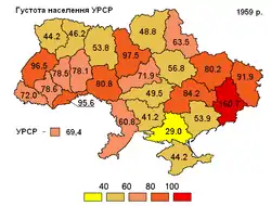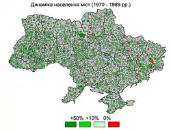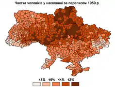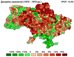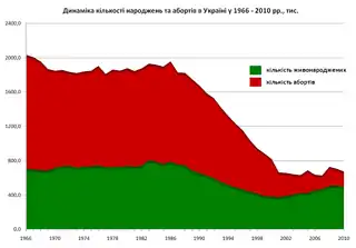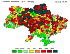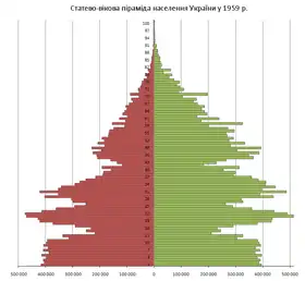 У другій половині XX століття динаміка показників демографії України характеризується швидким відновленням населення з подальшим зниженням темпів приросту й негативним приростом населення в 90-х роках. У Другій світовій війні Україна втратила 14 млн осіб[4]. Тільки в 1959 році, в Українській Радянській Соціалістичній Республіці, чисельність населення сягнула довоєнного періоду в 42,1 млн осіб. Проте, при подальшому збільшенні загальної чисельності населення, динаміка показників природного та міграційного приросту людності вже характеризується тенденцією до зниження. Так, упродовж першого повоєнного міжпереписного періоду (1959—1970 роки) чисельність населення зросла на 12,5 %, протягом другого (1970—1979 роки) — на 5,4 %, третього (1979—1989 роки) — лише на 3,7 %. У період 1989—1993 років чисельність населення України зросла всього на 1,5 %. Того ж 1993 року було зафіксовано найбільшу чисельність населення України — 52,2 млн осіб. Проте наприкінці 90-х років Україна почала втрачати населення. Кількість людності в Україні 2001 року в порівнянні з 1993 роком скоротилася на 7,2 %.