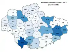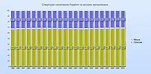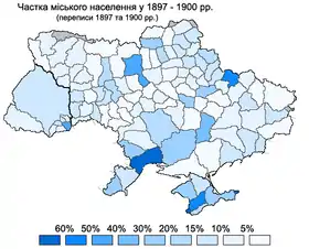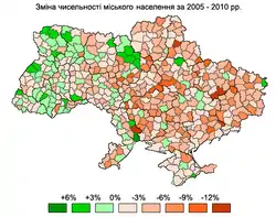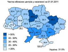 . Рівень урбанізованості досить високий — 65,09 %; в країні налічується 1345 міських поселень, з яких три міста-мільйонника — Київ (столиця), Харків, й Одеса. Міста Дніпро і Донецьк внаслідок депопуляції втратили частину населення і статус мільйонника