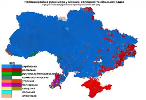 . Офіційна мова — українська, дуже поширена у вжитку російська мова, регіонально — кримськотатарська (Крим), румунська (Буковина), угорська (Закарпаття) та інші