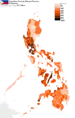 Населення Філіппін. Чисельність населення країни 2015 року становила 100,998 млн осіб (13-те місце у світі)[1]. Чисельність філіппінців стабільно збільшується, народжуваність 2015 року становила 24,27 ‰ (59-те місце у світі), смертність — 6,11 ‰ (160-те місце у світі), природний приріст — 1,61 % (74-те місце у світі)