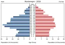 Населення Чорногорії. Чисельність населення країни 2015 року становила 647,1 тис. осіб (168-ме місце у світі)[1]. Чисельність чорногорців стабільно зменшується, народжуваність 2015 року становила 10,42 ‰ (188-ме місце у світі), смертність — 9,43 ‰ (57-ме місце у світі), природний приріст — -0,42 % (221-ше місце у світі)