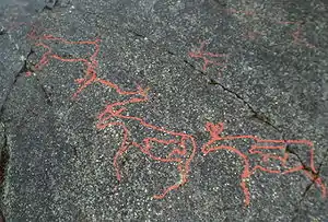 На наскельних малюнках можна знайти широкий спектр тваринного світу. Серед них найбільш типовим є зображення оленів, досить часто вони об'єднані у великі стада, на які ведеться полювання. Зображення оленів за плотом, скоріш за все, вказують на те, що якийсь контроль над цими тваринами існував із давніх часів. Крім оленів часто можна знайти зображення лосів, різноманітних видів птахів і риб. Вагітні тварини часто зображались із плодами які можна побачити всередині своєї матері.