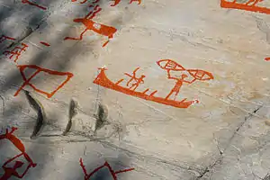 Особливий інтерес представляють малюнки човнів: в той час як найбільші риболовні човни з'являються із самих ранніх петрографів, пізніше з'являються все більш великі судна, деякі з них перевозять і до 30 людей і прикрашені зображеннями тварин на носовій і кормовій частинах, нагадуючи драккари вікінгів. Це, стоїть поруч з тим фактом, що подібні зображення великих човнів були знайдені в прибережних районах на півдні Норвегії, скоріш за все, вказують на можливість дальніх подорожей вздовж берегів на цих човнах.