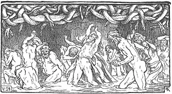 sólo fiarri, Nástrǫndu á, norðr horfa dyrr. Fello eitrdropar inn um lióra. Sá er undinn salr orma hryggiom. Sá hón þar vaða þunga strauma menn meinsvara ok morðvarga ok þannz annars glepr eyrarúno. Þar saug Níðhǫggr nái framgengna, sleit vargr vera. Vitoð ér enn, eða hvat? |