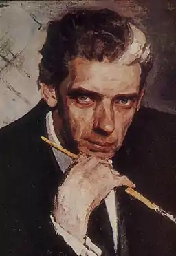 У 1975 році художник вирішив розповісти на полотні про себе. «Автопортрет», написаний у цьому році, — це образ людини — творця, зображеного в хвилину глибоких роздумів. Художник вибрав найпростішу сидячу позу, скромну, неголосну, нейтральну сіро-блакитну з чорним відтінком колоритну гаму, яка б гармонізувала з його психологічним станом.