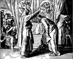 У 1 Царів 1:8-45 Натан говорить вмираючому Давиду про змову Адонії стати царем, яка однак закінчилась тим, що царем став Соломон. За порадою пророка Натана і при його підтримці Вірсавії вдалося переконати царя поспішити з виконанням даної їй обіцянки: назначити їхнього сина Соломона своїм спадкоємцем і помазати його зразу ж на царство. Священик Садок в супроводі пророка Натана, Бенаї і відділу царських тілоохоронців повезли Соломона на царському ослі до джерела Гіхон, де Цадок помазав його на царство. Коли роздалися звуки рогу, народ закричав: "Нехай живе цар!". Народ стихійно пішов за Соломоном, супроводжуючи його у двір з музикою і ликуючими криками. Це описується так:
