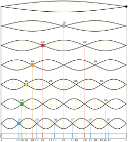 коломC 15 : 16 1 : 1 1 0,000 Ц des 15 : 16 15 : 16 1,0666... 111,731 Ц в.терція вниз від F D 128 : 135 8 : 9 1,125 203,910 Ц es 15 : 16 5 : 6 1,2 315,641 Ц в.терція вниз від G e 24 : 25 4 : 5 1,25 386,314 Ц в.терція вверх від C F 15 : 16 3 : 4 1,333... 498,045 Ц fis 128 : 135 32 : 45 1,40625 590,224 Ц в.терція вверх від D G 15 : 16 2 : 3 1,5 701,955 Ц as 15 : 16 5 : 8 1,6 813,686 Ц в.терція вниз від C a 24 : 25 3 : 5 1,666... 884,359 Ц в.терція вверх від F B 15 : 16 9 : 16 1,777... 996,090 Ц h 128 : 135 8 : 15 1,825 1088,269 Ц в. терція вверх від G C 15 : 16 1 : 2 2 1200,000 Ц - Тони відмічені жирним шрифтом отримані за допомогою квінт, інші за допомогою терцій