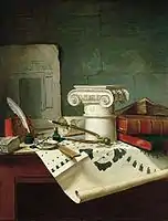 Себастьян Штоскопф. «Натюрморт з книгами і скульптурою вояка», перша половина 17 ст., Лувр, Париж.