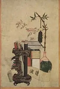 Приклади японських натюрмортів неможливо перелічити, так їх багато. Але присутні ті натюрморти і на японських ширмах, в стінописах, на віялах. Бо мистецтво Японії довго не знало картини олійними фарбами західноєвропейського зразку. Японські натюрморти віднайдені в творах Кано Санраку («Півонії»), Сотацу (ширма «Віяла» початку 17 ст.), Огата Корина («Осінні трави» розпис віяла початку 18 ст.), Огата Кендзан («Кошики з квітами», сувій початку 18 ст.)