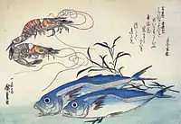 З поширенням гравюри до натюрмортів звертався велетень мистецтва Японії Кацусіка Хокусай — «Дерев'яний кінь», «Місяць, хурма та комаха», «Лілеї» ,Риба та мушля. А його «Манга» (замальовки) — повні малюнків речей, де є посуд, одяг, парасолі, паперові ліхтарі.