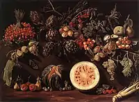 Іспанці підуть своїм шляхом і викинуть геть дріб'язки нідерландських манер. Франсіско де Сурбаран в своєму «Натюрморті з лимонами та апельсинами в кошику» 1633 р. покладе фрукти суворо і просто. І не пожалкує ніяких кольорів своєї палітри, аби всі побачили красу світу (Флоренція, збірка Контіні-Бонакоссі). Ще суворіше й простіше розмістив овочі в «Натюрморті з гарбузом» Хуан Санчес Котан. Одне яблуко, одна капустина, один гарбуз і одна його скибка, один огірок — от і весь сюжет. (м. Сан Дієго, США, Музей красних мистецтв).