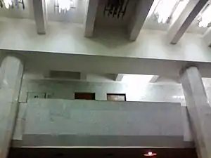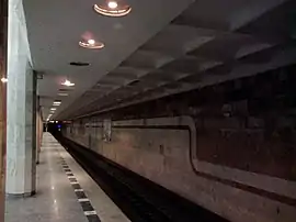 Колони і балкони оздоблені білим мармуром, колійні стіни — коричневим мармуром. Два ряди біломармурових колон, що підтримують балкони, ребриста поверхня стелі формують перспективу центрального залу станції.
