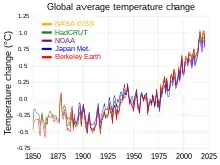 - Клімат Землі значно потеплів з кінця 1800-х років[lower-alpha 1].