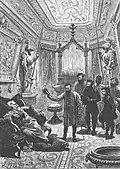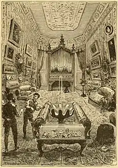 Далі йде їдальня завдовжки 5 метрів, оброблена і мебльована зі строгим смаком. По обох кінцях їдальні стоять високі дубові поставці, інкрустовані чорним деревом, на їхніх полицях з хвилеподібними краями встановлене начиння з дорогого фаянсу, порцеляни, кришталю і срібла. Посеред зали встановлено стіл. Щоб пом'якшити світло стельових світильників застосовано витончений розпис стелі[25].