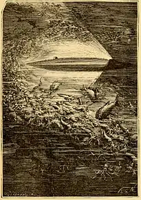 - Ілюстрація Ілюстрація до першого видання роману «Таємничий острів» 1874 року (художники Ньювілл і Р'ю)