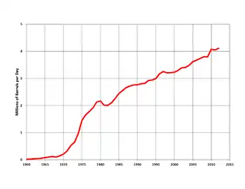 З 1973 р. почався експорт нафти. З 1978 р. приріст продукції припинився і стабілізувався на рівні близько 100 млн т на рік. На початку 80-х років XX ст. К. займав 6-е місце у світі за видобутком нафти.