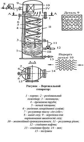 У конструкції вертикального нафтових сепараторів будь-якого типу розрізняють чотири секції (рис. 1).