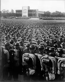Щоб обійти версальські обмеження, Німеччина співпрацювала з СРСР, що дало змогу Німеччині встановити в СРСР експериментальні центри для танків, хімічної зброї та дослідження авіації, а радянські офіцери їздили в Німеччину на військове навчання.[54] однак, це таємне співробітництво закінчилося з приходом Гітлера до влади в 1933 році.[54] Одразу ж після цього Гітлер наказав потроїти за один рік розмір німецької військової машини.[56] Німеччина встановила приховані потужності з виробництва військової техніки, зокрема виробництво кораблів понад обмеження Версальського договору, водночас у документах не називаючи своє військове керівництво "Генеральним штабом" (що було заборонено Версальським договором) та припинивши публікацію списку своїх офіцерів.[56] 16 березня 1935 року Гітлер здивував світові держави, прийнявши закон, що відкрито вимагав загальної військової служби і подальшого підвищення кількості військових до півмільйона осіб.[57] Такі країни як Франція і Велика Британія протестували, але не діяли, і це поклало край військовим обмеженням Версальського договору.[57]