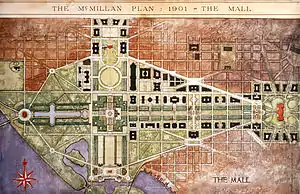 У 1901 р. під впливом громадського руху «За красиве місто» на світ з’явився План Макміллана, який розвинув оригінальну ідею Ленфана і радикально перетворив вигляд алеї, прибравши сади, теплиці, дерева, комерційні й промислові будівлі.[15] План Макміллана відрізнявся від плану Ленфана тим, що алея стала представляти собою трав’яну галявину завширшки 300 футів на якій висаджені 4 ряди в’язів. Будівлі культурних закладів у вишуканому стилі мали б розташовуватися по боках алеї позаду в’язів.[16][17][18][19]