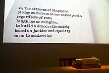 Уривок із національної обітниці на анімованому екрані в експозиції Національного музею Сінгапуру