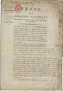 За декретом від 2 листопада 1789 року було конфісковано власність церкви і духовенства; починаючи з 30 березня 1792 року конфісковувалися власність емігрантів, засланців, страчених і інших осіб. Декрет від 27 липня 1792 року дозволила продаж національного майна, що сприяло зростанню спекуляції і виникнення так званих «чорних банд».