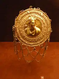 - Предмети, виявлені Шліманом у похованнях при розкопках Мікен — прикрашена коштовностями бронзова зброя, прикраси, керамічний посуд та золота поховальна маска, яка належала, як вважалося раніше, царю Агамемнону — так звана, Маска Агамемнона.