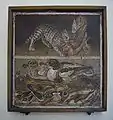 Натюрморт, зверху — кіт уполював птаха, знизу качки, риби і птахи