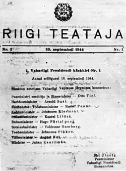 18 серпня призначений Комітетом тимчасовим президентом Юрі Улуотс приступив до формування національного уряду на чолі з Отто Тіїфом, який до цього часу був обраний керівником Національного комітету. [4] Наступного дня, 19 серпня Юрі Улуотс вийшов у ефір із закликом докласти всіх зусиль для боротьби з наступаючими окупаційними військами Червоної Армії і вступати в німецькі формування. 25 серпня на засіданні Комітету Юрі Улуотс оголосив склад пропонованого ним уряду і ті з його членів, хто ще не входив до складу EVR, були туди кооптовані. Після рішення німців вивести війська з Естонії, Ю. Улуотс 18 вересня 1944 затвердив уряд на чолі з О. Тіїфом. [5] 21 вересня на вежі «Довгий Герман» в Талліні поруч з німецьким військовим прапором (нім. die Reichskriegsflagge) був урочисто піднятий менший за розміром синьо-чорно-білий прапор Естонії.