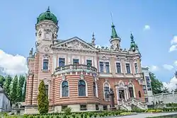 Головний корпус розташований на нинішньому проспекті Свободи, 20. Збудований на межі XIX–XX століть коштом Галицької ощадної каси і призначався для музею художніх промислів, який на той час не мав власного приміщення. Для будівництва містом було надано ділянку — південну частину площі Каструм, що залишалась незабудованою після того, як 1802 року було розібрано львівський Низький замок. 1888 року Галицька ощадна каса виділила 400 тис. корон і наступного року було проведено конкурс ескізів, на якому перемогу здобула робота професора львівської Вищої політехнічної школи скульптора Леонарда Марконі. 1890 року було проведено другий тур, де переможцем став професор Політехнічної школи архітектор Густав Бізанц. Друге місце посів проєкт краківського архітектора Яна Завейського, а третє — проєкт Леонарда Марконі. Однак інвестор відмовився від реалізації проєкту Бізанца і проєктування було доручено одному з членів журі Юзефу Каетану Яновському, котрий у співавторстві зі скульптором Леонардом Марконі розробив новий проєкт, який було реалізовано протягом 1898—1904 років будівельною фірмою Едмунда Жиховича. В проєктуванні взяв участь також і практикант Яновського — молодий архітектор Євген Весоловський. Орнаментальну ліпнину, виконаною Антонієм Попелем і Михайлом Паращуком. Між колонами портиків розташовувалися алегоричні скульптури Петра Війтовича, знищені 1952 року під час адаптації будівлі під музей імені В. Леніна. Тоді ж в інтер'єрі музею знищено скульптуру «Гончар» авторства Григорія Кузневича.