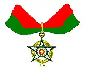 Стрічка ордена з двох рівновеликих горизонтальних смуг червоного й зеленого кольорів. До стрічки офіцера кріпиться розетка діаметром 27 мм з такої ж стрічки. Ширина стрічки Великого хреста — 101 мм, решти ступенів — 37 мм. На стрічку в місці стику смуг кріпиться позолочена п'ятикінцева зірочка (на стрічці Великого хреста — діаметром 22 мм).