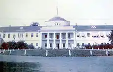 Центральна частина палацу увінчана напівсферичним декоративним куполом на високому рустованому барабані. Ребристий купол завершується невеликим оглядовим майданчиком, захищеними металевими ґратами. По периметру барабана є ряд овальних вікон, обрамлених профільованою лиштвою. Центральна частина головного фасаду палацу підкреслена глибокою лоджією в два поверхи, обмеженою кутовими пілонами і 4-колонним портиком доричного ордеру, несучим антаблементом з тригліфами і розетками в метопах. Завершується портик складним за композицією уступчастим фронтоном, обабіч якого — парапет-балюстрада, прикрашена вазами. З боків центральної частини фронтону — скульптура, а в центрі — ліпна композиція, обмежена спареними пілястрами, що несуть антаблемент і трикутний фронтон. Стіни головного фасаду оброблені рустом. Віконні отвори прямокутні, над ними в 2-му поверсі прямі сандрики і ліпні прикраси.